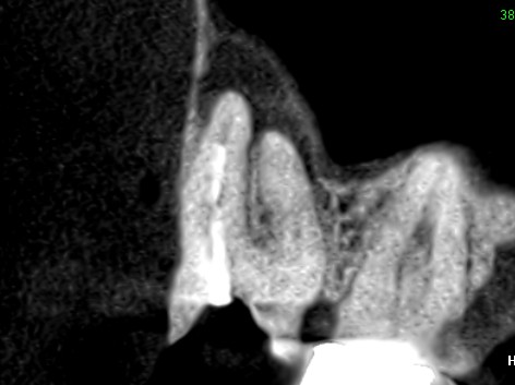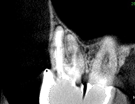 初診時のCT画像です。根管治療不足で根管充填が根の先まで足りていません。