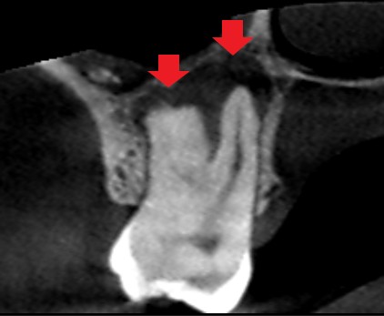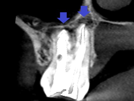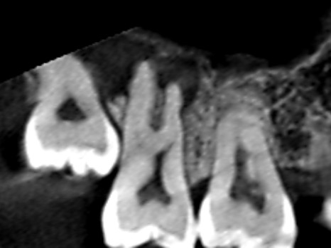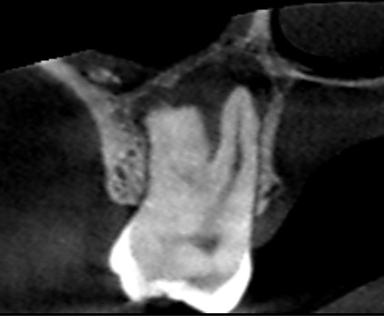 精密根管治療2年後の患部の矢状断のCT画像です。第三大臼歯に達していた大きな膿が消失し歯槽骨が再生しています。