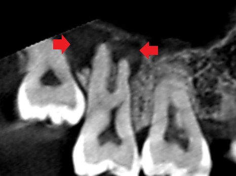 CT画像で確認したところ、第二大臼歯の根の先に大きな膿がみられました。膿は、歯茎の中に埋まっている親知らずに達するほどの大きな膿でした。通常、根の先に膿がある場合は、根管治療が事前にされているか、むし歯や歯に破折がみられることが多いのですが、膿がある第二大臼歯は、根管治療されておらず、むし歯や破折もありませんでした。また、まれに歯列矯正治療が原因と考えられるケースもありますが、矯正治療の既往もありませんでした。