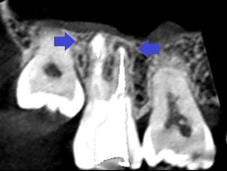 精密根管治療2年後の患部の冠状断のCT画像です。根の先を覆っていた全ての膿が消失し歯槽骨が再生しています。