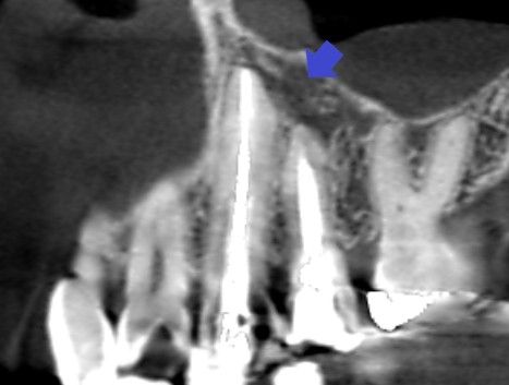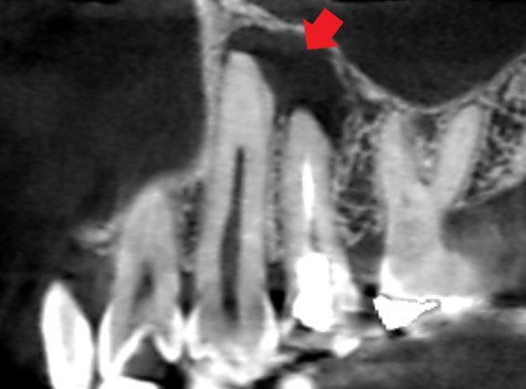 左上の犬歯と第一小臼歯のCT画像です。赤い矢印の先に、犬歯と第一小臼歯の両方の根の先にかかる大きな膿の影がみられます。