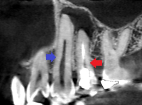 青い矢印の先が犬歯です。赤い矢印の先が、第一大臼歯です。犬歯には、膿の原因になりそうなむし歯や詰め物もされておらず、歯の神経に達するようなヒビもみられません。隣の第一大臼歯の膿が原因で犬歯の神経が壊死してしまったことが考えられました。