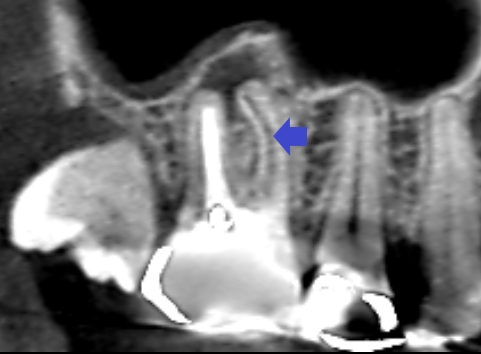 しかし、CTの画像を少しずらしてみると、同じ近心頬側根の中にもう一つの未治療の根管がみられました。青い矢印の先に黒い筋がみられます。これが未治療の根管です。