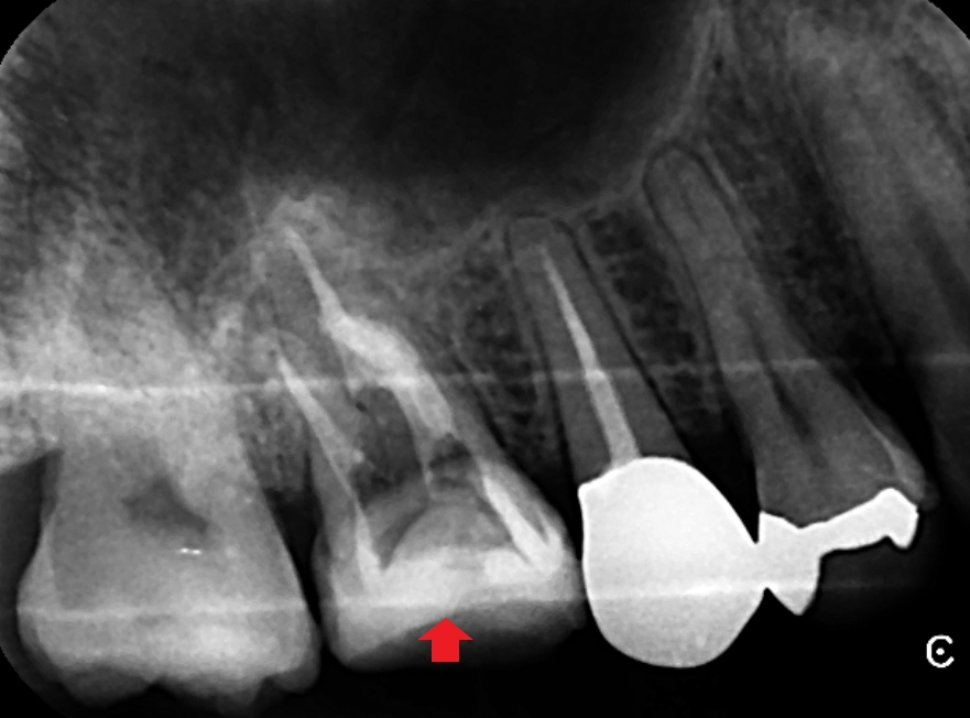 赤い矢印の先に膿の影がみられます。青い矢印の先の近心頬側根の根管充填は、根の先にまで到達し上手く根管治療できているようにみえます。