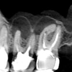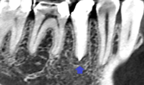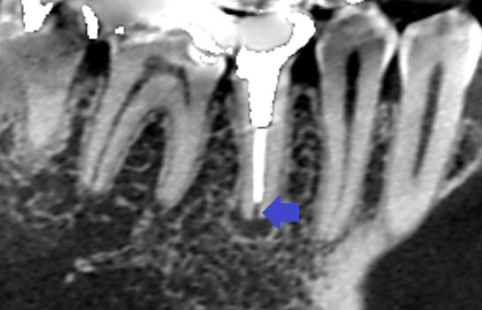 精密根管治療6ヶ月後の経過観察時のCT画像です。青い矢印の先にあった膿の影が消失し歯槽骨が再生しています。