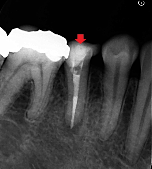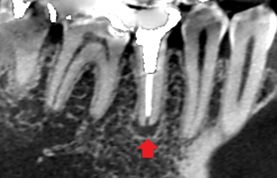 根管充填が根の先まで足りず、細菌が繁殖できる空間ができているために膿んでいる可能性があります(青い矢印の先)。