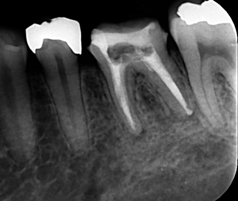 他の歯の治療でCTを撮影したところ膿が見つかったケースです。特に痛みや歯茎の腫れもなく、ご本人は膿の存在に気づかれていませんでした。下顎第一大臼歯にある二本の根の両方に膿がみられました。根管充填は二本とも必要なところまで届いていましたが、両方とも根の先に膿ができていました。根管の消毒不足による感染の残存、またはコロナルリーケージによる根管の再感染が考えられました。