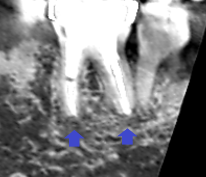 赤い矢印の先に膿の影がみられます。二本の根の両方に膿がみられ、両方の膿を改善しなければいけません。