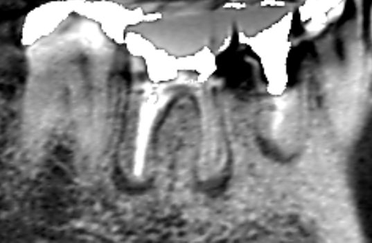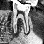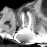 6カ月後の経過観察時のCT画像です。下顎第二小臼歯と第一大臼歯の根の先にあった膿の影が消え、歯槽骨が再生しています。