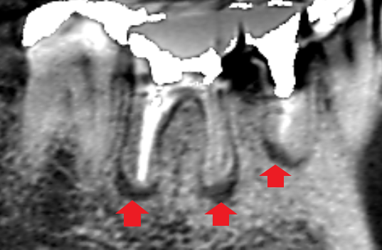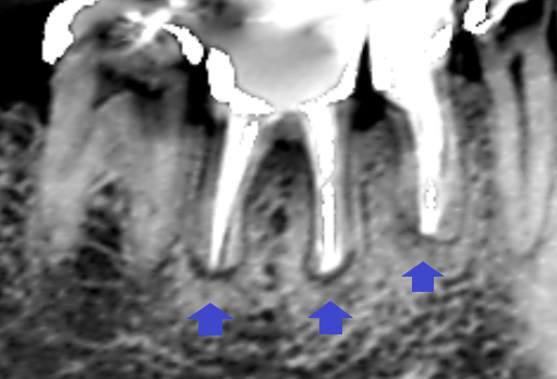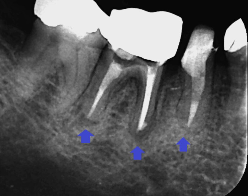 下顎第二小臼歯と第一大臼歯の根の先に膿の影がみられました。第一大臼歯は、2本ある根の両方に膿がみられます。