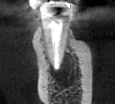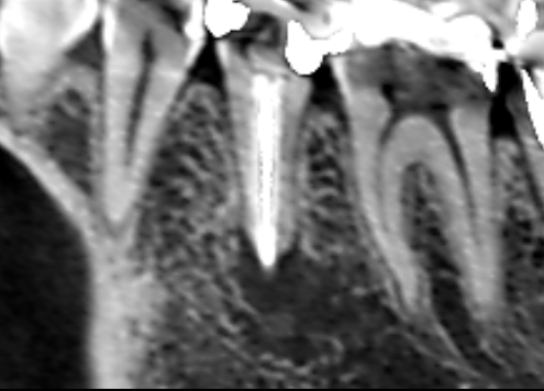 精密根管治療6カ月後の経過観察時の冠状断のCT画像です。下顎第二小臼歯の根の舌側に拡がっていた膿の影が消え、歯槽骨が再生しています。