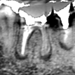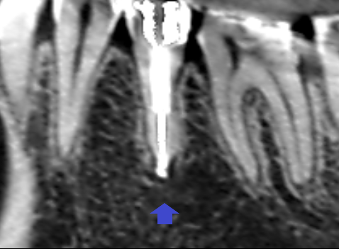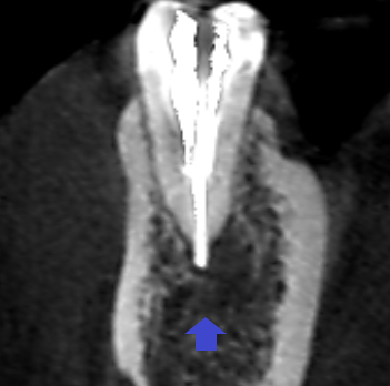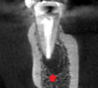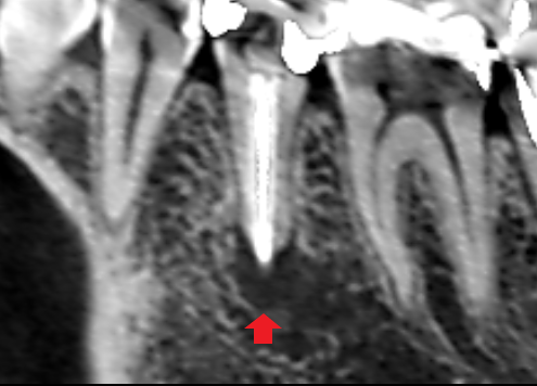 精密根管治療6カ月後の経過観察時の矢状断のCT画像です。下顎第二小臼歯の矢印の先にあった膿の影が消え、歯槽骨が再生しています。