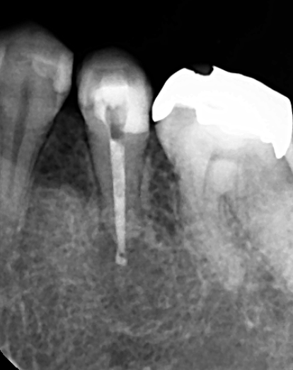 精密根管治療を行った根管充填時のレントゲン写真です。根の先までしっかり根管充填しました。