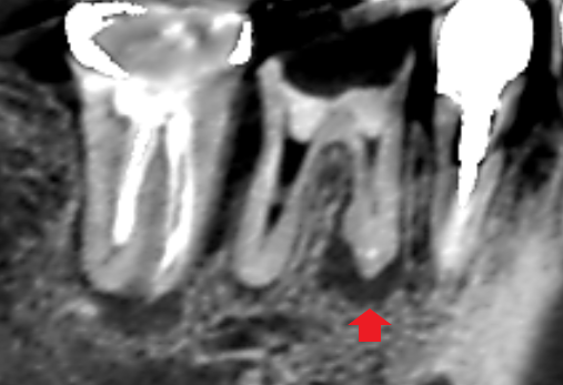 赤い矢印の先の下顎第一大臼歯の近心根の根の先に膿の影がみられます。