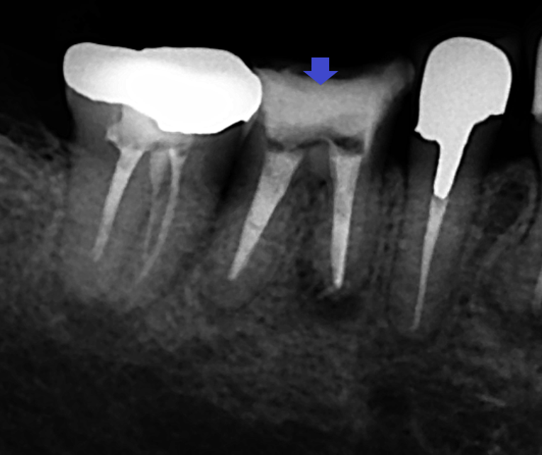 下顎第二大臼歯の近心根の近心側に歯槽骨の吸収による長い影がみられます。歯根破折が疑えます。
