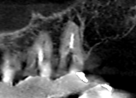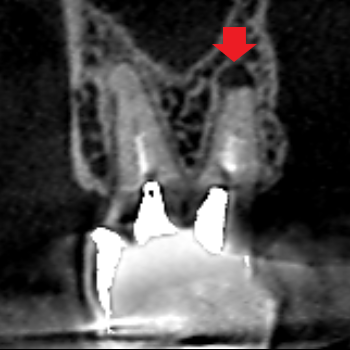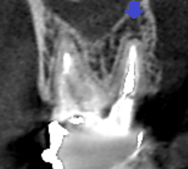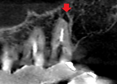 精密根管治療6カ月後の経過観察時の矢状断のCT画像です。上顎第二大臼歯の口蓋根の先にみられた膿の影が縮小し歯槽骨が再生しています。