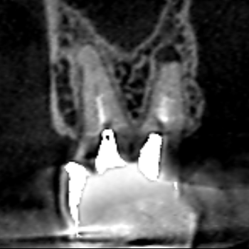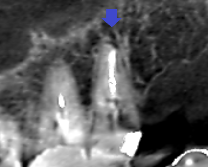精密根管治療6カ月後の経過観察時の冠状断のCT画像です。上顎第二大臼歯の口蓋根の先にみられた膿の影が縮小し歯槽骨が再生しています。