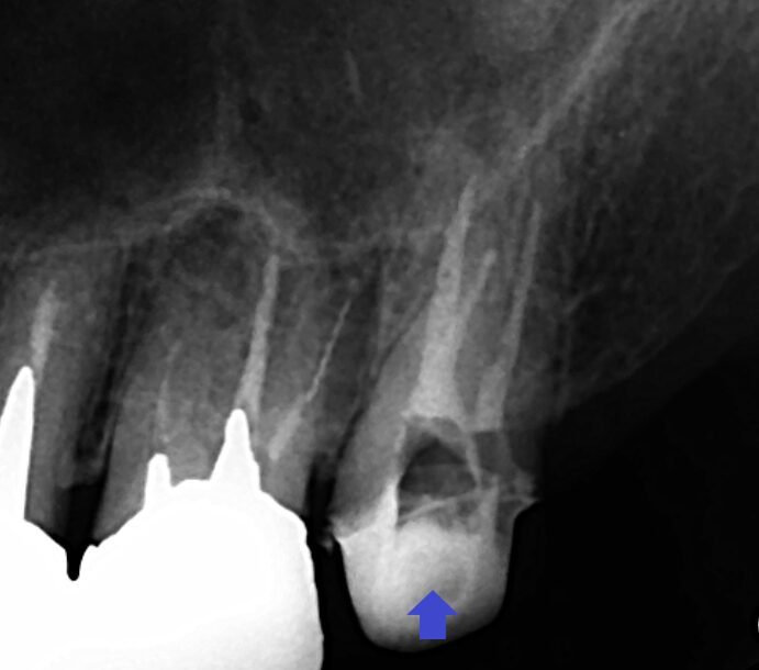 矢印の上顎第二大臼歯の口蓋根の先に膿の影がみられます。根の先まで根管充填が届いていないのが分かります。