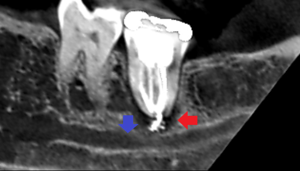 赤い矢印の先に膿の黒い影がみられます。膿の影は、青い矢印の先にある太い下顎の神経に達し、この神経を圧迫し激痛を発していることが考えられました。