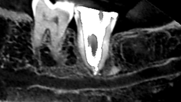 根管充填の6ヶ月後のCT画像です。膿の影が消失し、下顎の太い神経の圧迫もなくなりました。