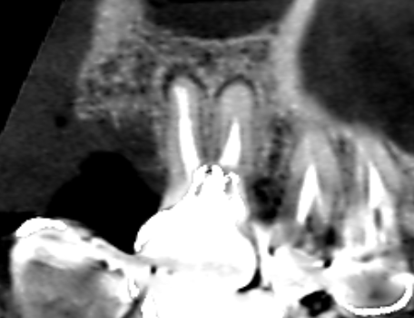 精密根管治療6カ月後の経過観察時の矢状断のCT画像です。上顎第一大臼歯の頬側2根共に根の先にみられた膿の影が消え歯槽骨が再生しています。