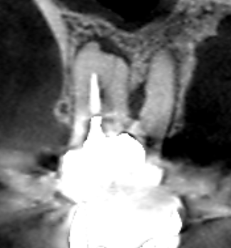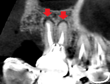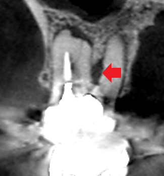 同じく上顎第一大臼歯の冠状断のCT画像の歯根分岐部に膿の影がみられます。髄床底にパーフォレーションがありました。