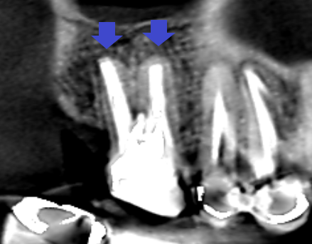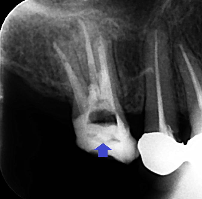 赤い矢印の先の近心頬側根に膿の影がみられます。近心頬側根には、青い矢印の先に黒い線が認められ、未治療の根管があります。近心頬側根の膿は未治療の根管が原因と思われます。