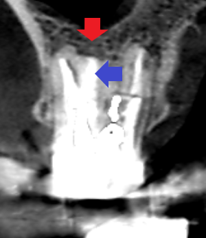 精密根管治療6カ月後の経過観察時の冠状断のCT画像です。青い矢印の先にあった未治療だった根管が根の先まで根管充填されています。赤い矢印の先にあった膿の影が消失し歯槽骨が再生しています。