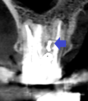 精密根管治療6カ月後の経過観察時の冠状断のCT画像です。青い矢印の先にあったパーフォレーションによる膿の影が消失しています。
