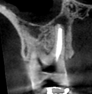 精密根管治療6カ月後の経過観察時の上顎大臼歯口蓋根の冠状断のCT画像です。