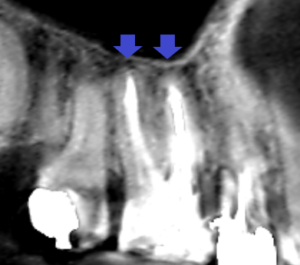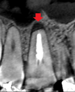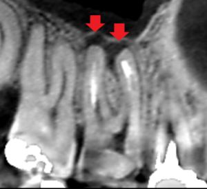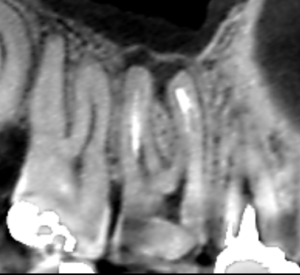 同じく上顎第一大臼歯の口蓋根の冠状断のCT画像です。