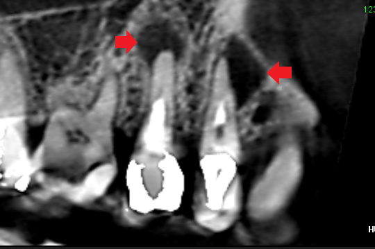 精密再根管治療の6ヶ月後のCT画像です。2本とも根の先にあった膿の消失を認めることができました。