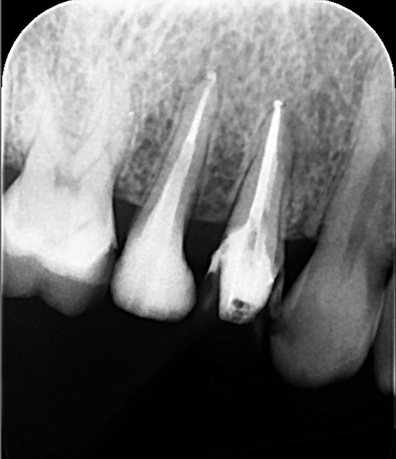 根管の石灰化を除去し根の先まで根管充填を行いました。