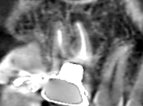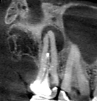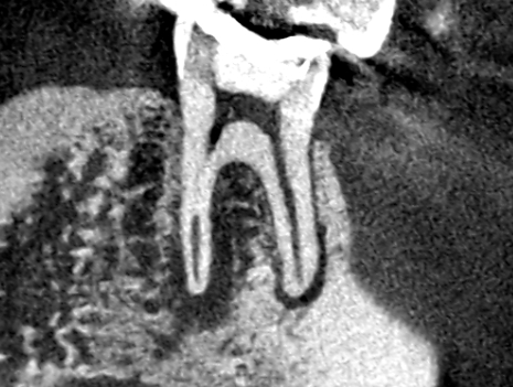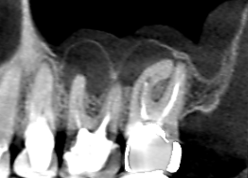 上顎第一大臼歯の根の先と根の分岐部の両方に膿がみられたケースです。他の歯の根管治療でCTを撮影し…