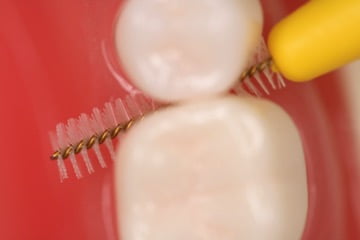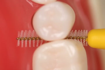 場合によってはデンタルフロスを使って清掃したほうがよいこともあるので、歯間ブラシを使うべきかどうかは、歯科医師の指示を仰いでください。