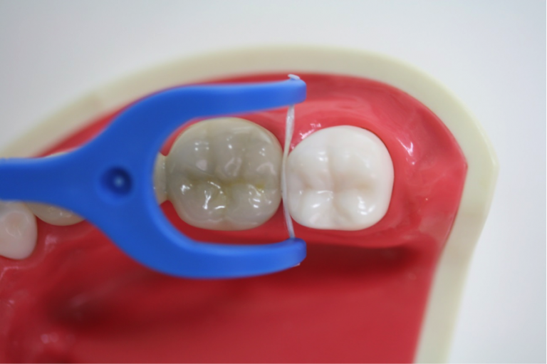 フロスを直角に当てたら、のこぎりを引くようにデンタルフロスを動かしていって、歯と歯が接触しているところを通過させると隙間に通りやすいです。