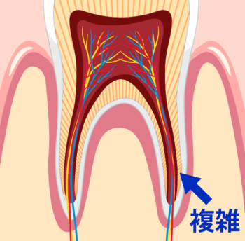 さらに、根管を清掃するためのファイルという医療器具が根管内に折れ込んで根管をふさいでいたり、根管内が石灰化沈着を起こしていて塞がってしまいその先の根管の感染が除去できないなどもあります。